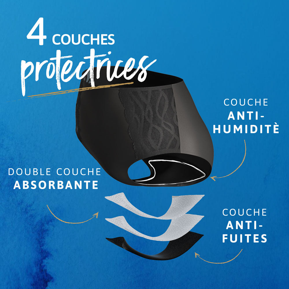 La performance intégrée a vos sous-vêtementsUn gousset de protection intégré, fait de 4 couches, pour une protection invisible.